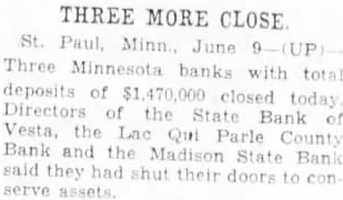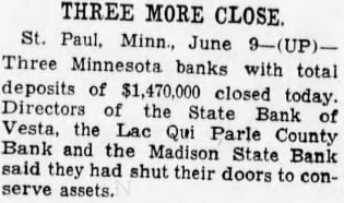THREE MORE CLOSE St. Paul, Minn June 9. Three Minnesota banks with total deposits of $1. 170,000 closed today Directors of the State Bank of Vesta, the Lac Qui Parle County Bank and the Madison State Bank said they had shut their doors to serve