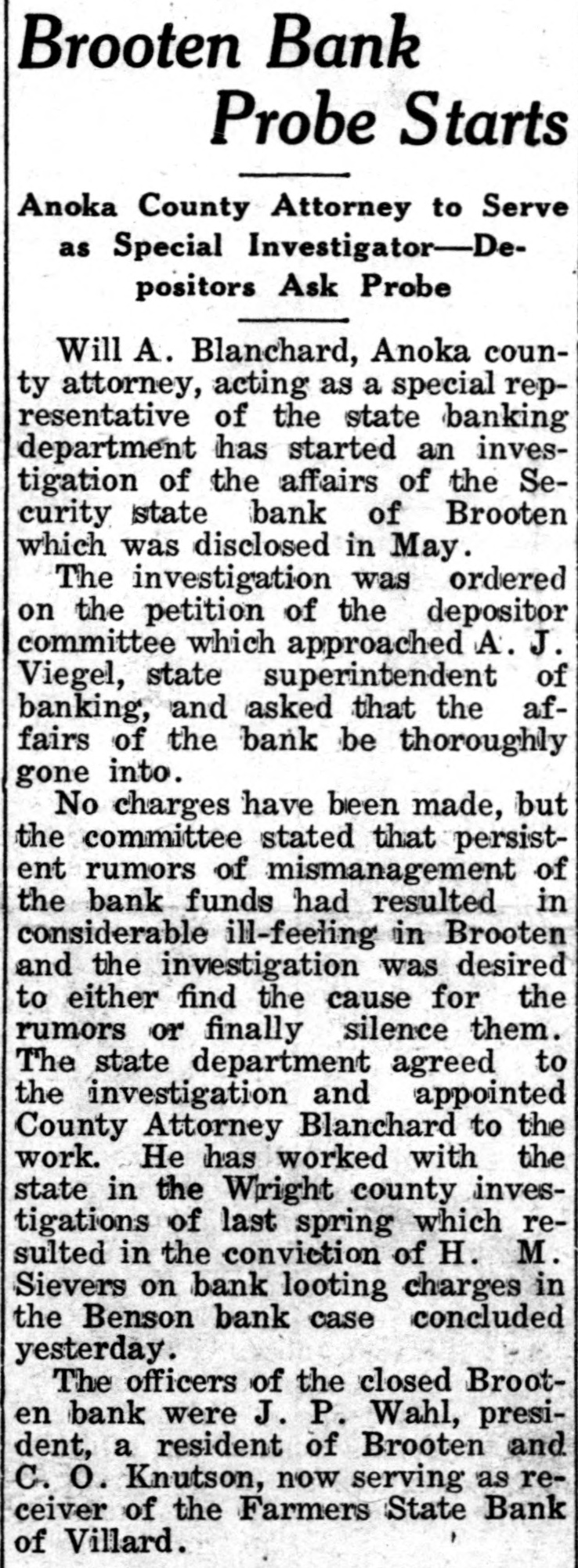 Brooten Bank Probe Starts Anoka County Attorney to Serve as Special Investigator-Depositors Ask Probe Will A. Blanchard, Anoka county attorney, acting as a special representative of the state banking department has started an investigation of the affairs of the Security state bank of Brooten which was disclosed in May. The investigation was ordered on the petition of the depositor committee which approached A. J. Viegel, state superintendent of banking, and asked that the affairs of the bank be thoroughly gone into. No charges have been made, but the committee stated that persistent rumors of mismanagement of the bank funds had resulted in considerable ill-feeling in Brooten and the investigation was desired to either find the cause for the rumors or finally silence them. The state department agreed to the investigation and appointed County Attorney Blanchard to the work. He has worked with the state in the Wright county investigations of last spring which resulted in the conviction of H. M. Sievers on bank looting charges in the Benson bank case concluded yesterday. The officers of the closed Brooten bank were J. P. Wahl, president, a resident of Brooten and C. 0. Knutson, now serving as receiver of the Farmers State Bank of Villard.