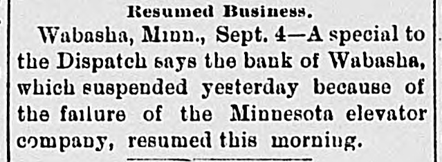 Resumed Business. Wabasha, Minn., Sept. 4-A special to the Dispatch says the bank of Wabasha, which suspended yesterday because of the failure of the Minnesota elevator company, resumed this morning.