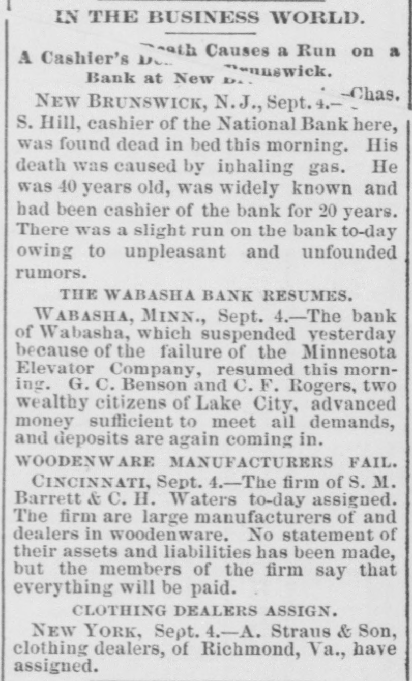 IN THE BUSINESS WORLD. with Causes a Run on a A Cashier's unswick. Bank at New DA . -Chas. NEW BRUNSWICK, N.J., Sept. 4. S. Hill, cashier of the National Bank here, was found dead in bed this morning. His death was caused by inhaling gas. He was 40 years old, was widely known and had been cashier of the bank for 20 years. There was a slight run on the bank to-day owing to unpleasant and unfounded rumors. THE WABASHA BANK RESUMES. W ABASHA, MINN., Sept. 4.-The bank of Wabasha, which suspended yesterday because of the failure of the Minnesota Elevator Company, resumed this morning. G. C. Benson and C. F. Rogers, two wealthy citizens of Lake City, advanced money sufficient to meet all demands, and deposits are again coming in. WOODENW ARE MANUFACTURERS FAIL. CINCINNATI, Sept. -The firm of S. M. Barrett & C. H. Waters to-day assigned. The firm are large manufacturers of and dealers in woodenware. No statement of their assets and liabilities has been made, but the members of the firm say that everything will be paid. CLOTHING DEALERS ASSIGN. NEW YORK, Sept. 4.-A. Straus & Son, clothing dealers, of Richmond, Va., have assigned.