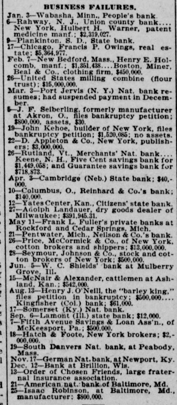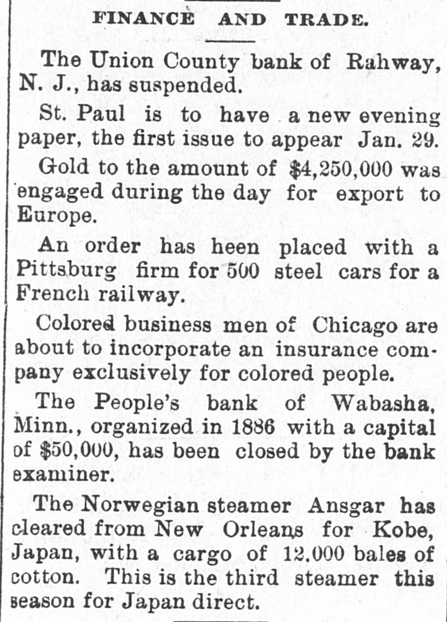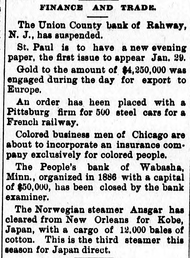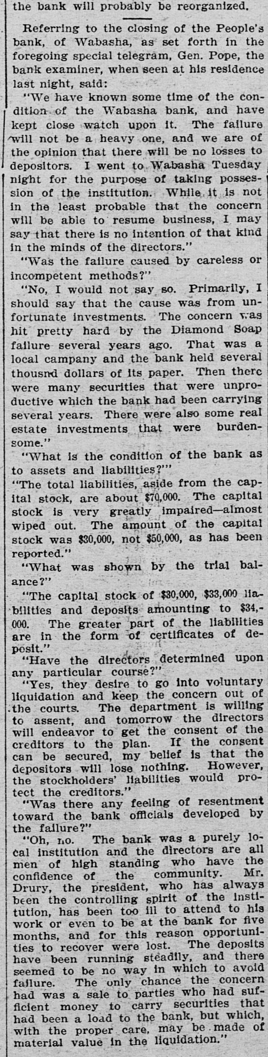 the bank will probably be reorganized. Referring to the closing of the People's bank, of Wabasha, as set forth in the foregoing special telegram, Gen. Pope, the bank examiner, when seen at his residence last night, said: "We have known some time of the condition of the Wabasha bank, and have kept close watch upon it. The failure /will not be a heavy one, and we are of the opinion that there will be no losses to depositors. I went to Wabasha Tuesday night for the purpose of taking possession of the institution. While it is not in the least probable that the concern will be able to resume business, I may say that there is no intention of that kind in the minds of the directors." "Was the failure caused by careless or incompetent methods?" "No, I would not say so. Primarily, I should say that the cause was from unfortunate investments. The concern was hit pretty hard by the Diamond Soap failure several years ago. That was a local campany and the bank held several thousnd dollars of its paper. Then there were many securities that were unproductive which the bank had been carrying several years. There were also some real estate investments that were burdensome." "What is the condition of the bank as to assets and liabilities?" "The total liabilities, aside from the capital stock, are about $70,000. The capital stock is very greatly impaired-almost wiped out. The amount of the capital stock was $30,000, not $50,000, as has been reported." "What was shown by the trial balance?" "The capital stock of $30,000, $33,000 liabilities and deposits amounting to $34,000. The greater part of the liabilities are in the form of certificates of deposit." "Have the directors determined upon any particular course?" "Yes, they desire to go into voluntary liquidation and keep the concern out of the courts. The department is willing to assent, and tomorrow the directors will endeavor to get the consent of the creditors to the plan. If the consent can be secured, my belief is that the depositors will lose nothing. However, the stockholders' liabilities would protect the creditors." "Was there any feeling of resentment toward the bank officials developed by the failure?" "Oh, no. The bank was a purely local institution and the directors are all men of high standing who have the confidence of the community. Mr. Drury, the president, who has always been the controlling spirit of the Institution, has been too ill to attend to his work or even to be at the bank for five months, and for this reason opportunities to recover were lost. The deposits have been running steadily, and there seemed to be no way in which to avoid failure. The only chance the concern had was a sale to parties who had sufficient money to carry securities that had been a load to the bank, but which, with the proper care, may be made of material value in the liquidation."