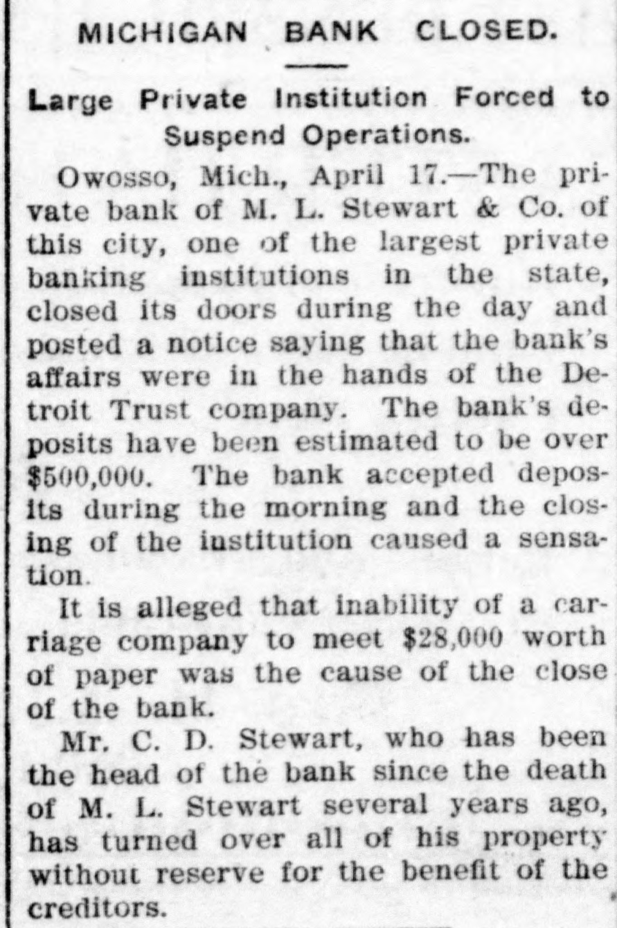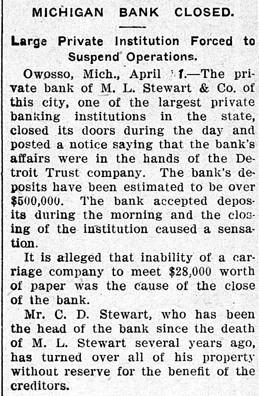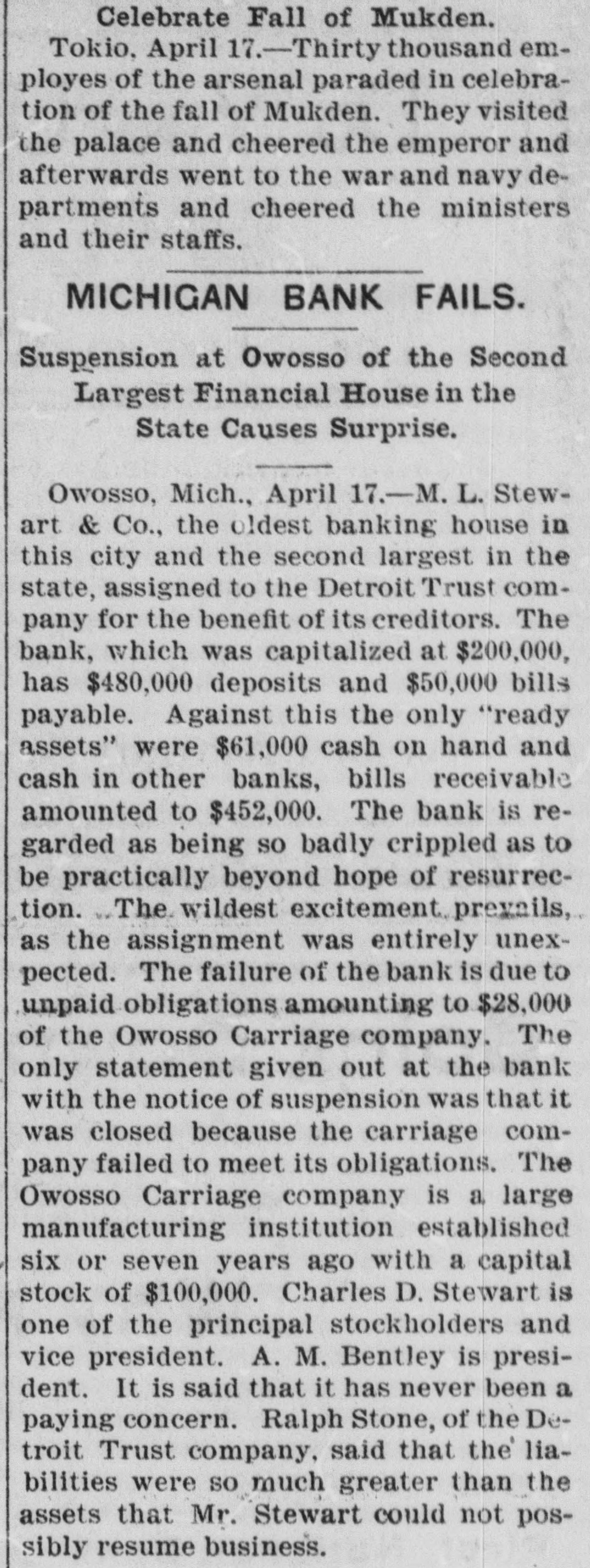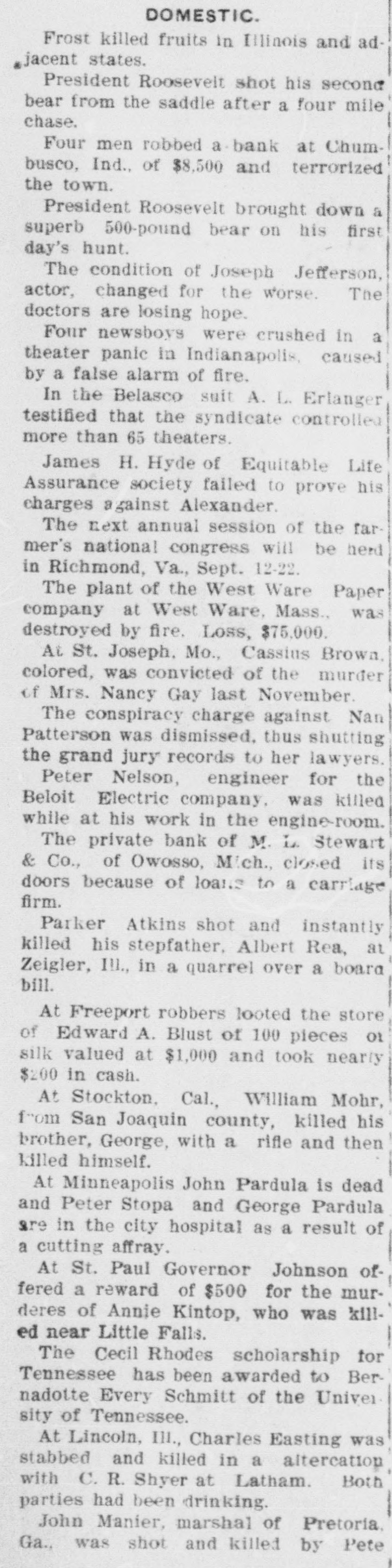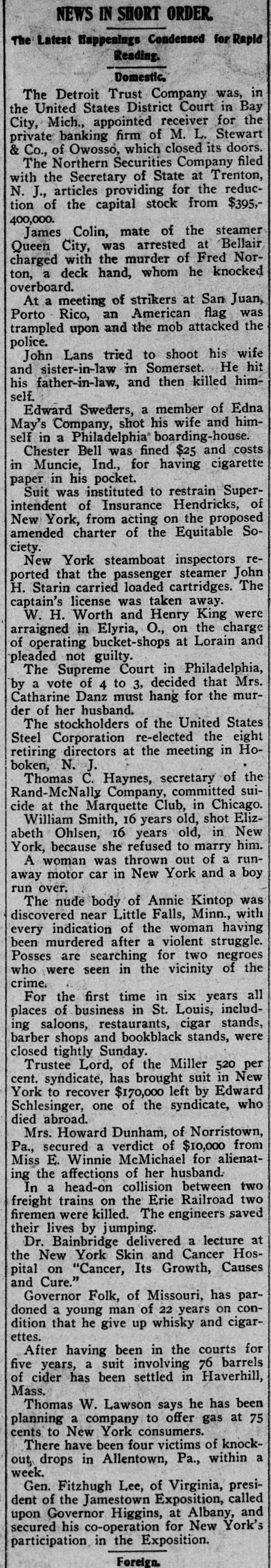 NEWS IN SHORT ORDER. The Latest Happenings Condensed for Rapid Reading. Domestic. The Detroit Trust Company was, in the United States District Court in Bay City, Mich., appointed receiver for the private banking firm of M. L. Stewart & Co., of Owosso, which closed its doors. The Northern Securities Company filed with the Secretary of State at Trenton, N. J., articles providing for the reduction of the capital stock from $395,400,000. James Colin, mate of the steamer Queen City, was arrested at Bellair charged with the murder of Fred Norton, a deck hand, whom he knocked overboard. At a meeting of strikers at San Juan, Porto Rico, an American flag was trampled upon and the mob attacked the police. John Lans tried to shoot his wife and sister-in-law in Somerset. He hit his father-in-law, and then killed himself. Edward Sweders, a member of Edna May's Company, shot his wife and himself in a Philadelphia boarding-house. Chester Bell was fined $25 and costs in Muncie, Ind., for having cigarette paper in his pocket. Suit was instituted to restrain Superintendent of Insurance Hendricks, of New York, from acting on the proposed amended charter of the Equitable Society. New York steamboat inspectors reported that the passenger steamer John H. Starin carried loaded cartridges. The captain's license was taken away. W. H. Worth and Henry King were arraigned in Elyria, O., on the charge of operating bucket-shops at Lorain and pleaded not guilty. The Supreme Court in Philadelphia, by a vote of 4 to 3, decided that Mrs. Catharine Danz must hang for the murder of her husband. The stockholders of the United States Steel Corporation re-elected the eight retiring directors at the meeting in Hoboken, N. J. Thomas C. Haynes, secretary of the Rand-McNally Company, committed suicide at the Marquette Club, in Chicago. William Smith, I6 years old, shot Elizabeth Ohlsen, 16 years old, in New York, because she refused to marry him. A woman was thrown out of a runaway motor car in New York and a boy run over. The nude body of Annie Kintop was discovered near Little Falls, Minn., with every indication of the woman having been murdered after a violent struggle. Posses are searching for two negroes who were seen in the vicinity of the crime. For the first time in six years all places of business in St. Louis, including saloons, restaurants, cigar stands, barber shops and bookblack stands, were closed tightly Sunday. Trustee Lord, of the Miller 520 per cent. syndicate, has brought suit in New York to recover $170,000 left by Edward Schlesinger, one of the syndicate, who died abroad. Mrs. Howard Dunham, of Norristown, Pa., secured a verdict of $10,000 from Miss E. Winnie McMichael for alienating the affections of her husband. In a head-on collision between two freight trains on the Erie Railroad two firemen were killed. The engineers saved their lives by jumping. Dr. Bainbridge delivered a lecture at the New York Skin and Cancer Hospital on "Cancer, Its Growth, Causes and Cure." Governor Folk, of Missouri, has pardoned a young man of 22 years on condition that he give up whisky and cigarettes. After having been in the courts for five years, a suit involving 76 barrels of cider has been settled in Haverhill, Mass. Thomas W. Lawson says he has been planning a company to offer gas at 75 cents to New York consumers. There have been four victims of knockout, drops in Allentown, Pa., within a week. Gen. Fitzhugh Lee, of Virginia, president of the Jamestown Exposition, called upon Governor Higgins, at Albany, and secured his co-operation for New York's participation in the Exposition. Foreign.