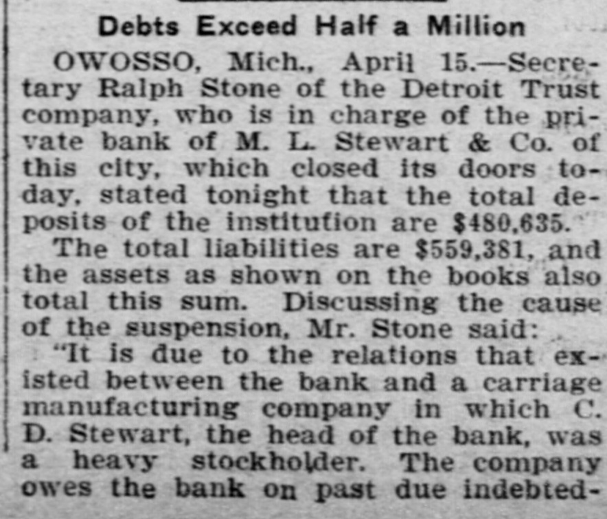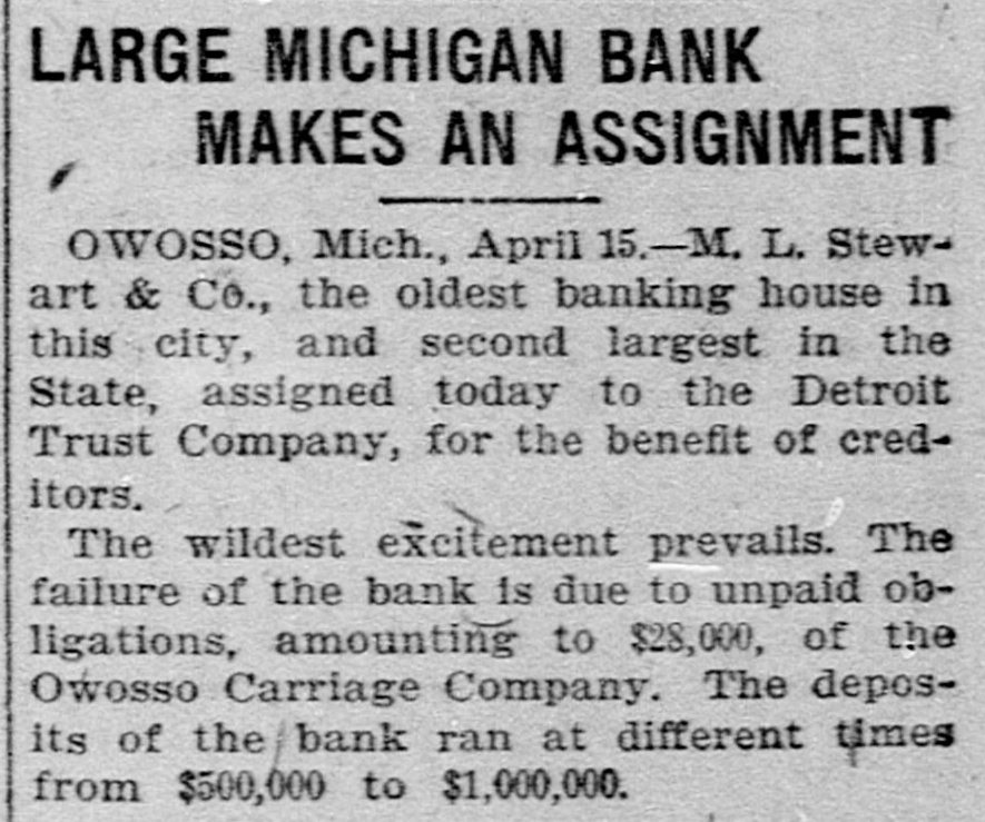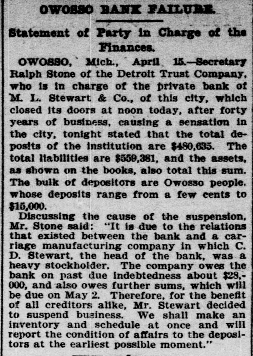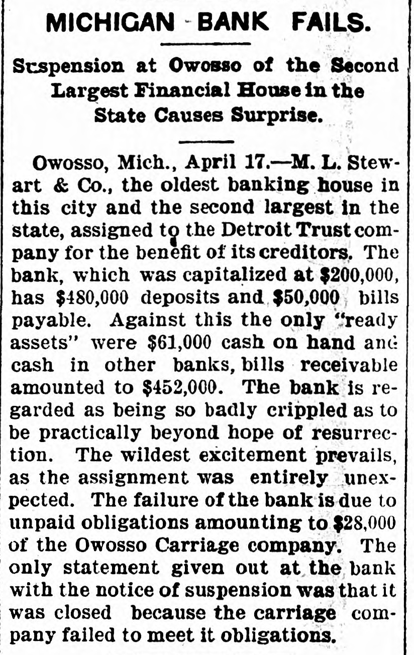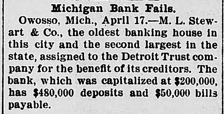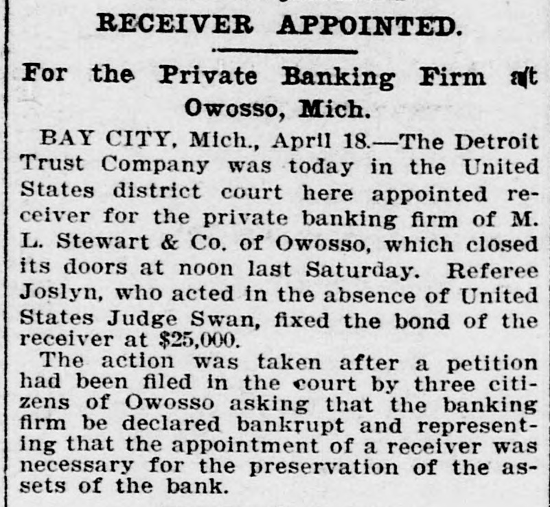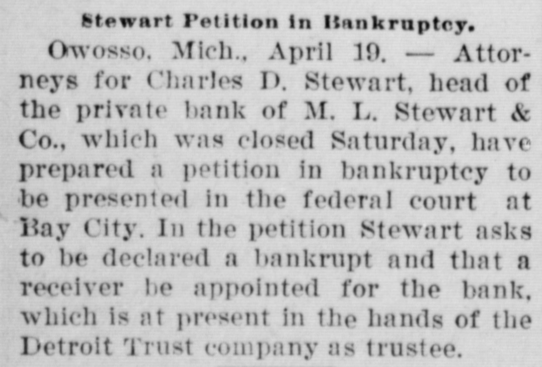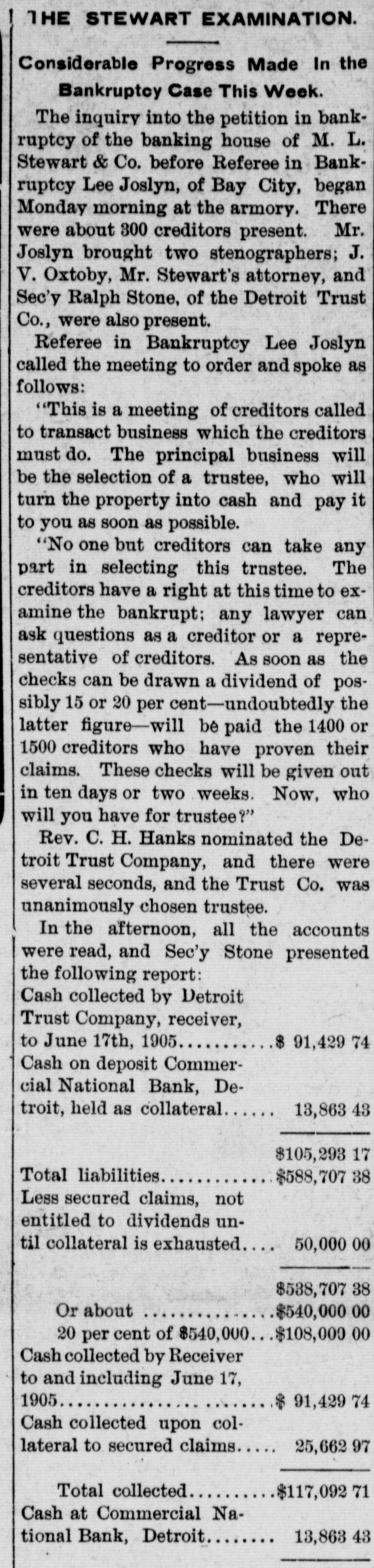 NEWS IN SHORT ORDER. The Latest Happenings Condensed for Rapid Reading. Domestic. The Detroit Trust Company was, in the United States District Court in Bay City, Mich., appointed receiver for the private banking firm of M. L. Stewart & Co., of Owosso, which closed its doors. The Northern Securities Company filed with the Secretary of State at Trenton, N. J., articles providing for the reduction of the capital stock from $395,400,000. James Colin, mate of the steamer Queen City, was arrested at Bellair charged with the murder of Fred Norton, a deck hand, whom he knocked overboard. At a meeting of strikers at San Juan, Porto Rico, an American flag was trampled upon and the mob attacked the police. John Lans tried to shoot his wife and sister-in-law in Somerset. He hit his father-in-law, and then killed himself. Edward Sweders, a member of Edna May's Company, shot his wife and himself in a Philadelphia boarding-house. Chester Bell was fined $25 and costs in Muncie, Ind., for having cigarette paper in his pocket. Suit was instituted to restrain Superintendent of Insurance Hendricks, of New York, from acting on the proposed amended charter of the Equitable Society. New York steamboat inspectors reported that the passenger steamer John H. Starin carried loaded cartridges. The captain's license was taken away. W. H. Worth and Henry King were arraigned in Elyria, O., on the charge of operating bucket-shops at Lorain and pleaded not guilty. The Supreme Court in Philadelphia, by a vote of 4 to 3, decided that Mrs. Catharine Danz must hang for the murder of her husband. The stockholders of the United States Steel Corporation re-elected the eight retiring directors at the meeting in Hoboken, N. J. Thomas C. Haynes, secretary of the Rand-McNally Company, committed suicide at the Marquette Club, in Chicago. William Smith, I6 years old, shot Elizabeth Ohlsen, 16 years old, in New York, because she refused to marry him. A woman was thrown out of a runaway motor car in New York and a boy run over. The nude body of Annie Kintop was discovered near Little Falls, Minn., with every indication of the woman having been murdered after a violent struggle. Posses are searching for two negroes who were seen in the vicinity of the crime. For the first time in six years all places of business in St. Louis, including saloons, restaurants, cigar stands, barber shops and bookblack stands, were closed tightly Sunday. Trustee Lord, of the Miller 520 per cent. syndicate, has brought suit in New York to recover $170,000 left by Edward Schlesinger, one of the syndicate, who died abroad. Mrs. Howard Dunham, of Norristown, Pa., secured a verdict of $10,000 from Miss E. Winnie McMichael for alienating the affections of her husband. In a head-on collision between two freight trains on the Erie Railroad two firemen were killed. The engineers saved their lives by jumping. Dr. Bainbridge delivered a lecture at the New York Skin and Cancer Hospital on "Cancer, Its Growth, Causes and Cure." Governor Folk, of Missouri, has pardoned a young man of 22 years on condition that he give up whisky and cigarettes. After having been in the courts for five years, a suit involving 76 barrels of cider has been settled in Haverhill, Mass. Thomas W. Lawson says he has been planning a company to offer gas at 75 cents to New York consumers. There have been four victims of knockout, drops in Allentown, Pa., within a week. Gen. Fitzhugh Lee, of Virginia, president of the Jamestown Exposition, called upon Governor Higgins, at Albany, and secured his co-operation for New York's participation in the Exposition. Foreign.